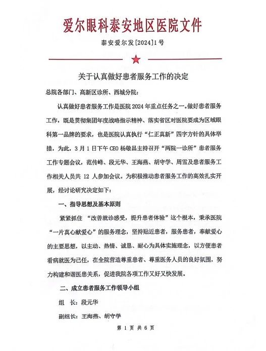 為進(jìn)一步鞏固提升醫(yī)院優(yōu)質(zhì)服務(wù)成果,持續(xù)深化“以患者為中心”的現(xiàn)代化醫(yī)院優(yōu)質(zhì)服務(wù)建設(shè),3月6日下午,愛爾眼科泰安地區(qū)召開“篤志患者服務(wù) 提升綜合實力 推動醫(yī)院高質(zhì)量發(fā)展”動員大會,泰安光明愛爾眼科醫(yī)院(總院)全體員工及泰安愛爾眼科醫(yī)院(分院)各科主任及員工代表、高新區(qū)診所全體員工參加會議。愛爾眼科泰安地區(qū)總院長范傳峰主持會議。 01領(lǐng)導(dǎo)講話 行政副院長、患者服務(wù)小組組長段元華宣讀愛爾眼科泰安地區(qū)2024年1號文件《關(guān)于認(rèn)真做好患者服務(wù)工作的決定》,并對各部門具體實施方案進(jìn)行了部署。 行政副院長段元華表示,“全面改善就診感受,提升患者體驗”是我院綜合服務(wù)水平的根本,也是醫(yī)院高質(zhì)量發(fā)展的迫切需要。因此醫(yī)院秉承“一片真心獻(xiàn)愛心”的服務(wù)理念,成立“患者服務(wù)工作領(lǐng)導(dǎo)小組”,在全院范圍內(nèi)開展以促進(jìn)“提升病人滿意度”為核心的指導(dǎo)、督導(dǎo)工作。 ?CEO楊敬昌做了題為《篤志患者服務(wù) 提升綜合實力?推動醫(yī)院高質(zhì)量發(fā)展》的動員講話,闡明了我院開展好患者服務(wù)工作的重要意義,要求大家進(jìn)一步統(tǒng)一思想,提高認(rèn)識,把工作重點統(tǒng)一到醫(yī)院的決策部署上來,扎實開展優(yōu)質(zhì)服務(wù)工作。 楊敬昌要求大家要大張旗鼓、轟轟烈烈地開展好此項工作,要突出亮點特色,大力唱響“一片真心獻(xiàn)愛心”的服務(wù)口號,把開展好患者服務(wù)工作作為醫(yī)院黨建工作的重要內(nèi)容,將此項工作的貫徹落實提升到一個更高的政治水平,成立“共產(chǎn)黨員志愿者服務(wù)隊”,積極投身其中,發(fā)揮引領(lǐng)作用。 楊敬昌同時強(qiáng)調(diào),開展好患者優(yōu)質(zhì)服務(wù)工作還須做到思路清晰、重點突出,要緊緊圍繞“人員素養(yǎng)、就診環(huán)境、核心服務(wù)流程”三大重點有序開展,要以此項工作為契機(jī)和工作抓手,改善就診環(huán)境,著力提升員工素養(yǎng)水平,優(yōu)化核心服務(wù)流程,提升綜合實力,推進(jìn)醫(yī)院高質(zhì)量發(fā)展。 此次動員部署大會的成功召開,不僅為醫(yī)院工作未來的發(fā)展指明了方向,也為全體醫(yī)護(hù)人員注入了新的動力和信心。醫(yī)院員工紛紛表示,未來將立足崗位、拓展思維、集思廣益,堅持患者至上,為患者提供更高品質(zhì)、更有溫度的醫(yī)療服務(wù),提升廣大患者的就醫(yī)體驗,共同打造百姓人人稱贊的專業(yè)眼科醫(yī)院!